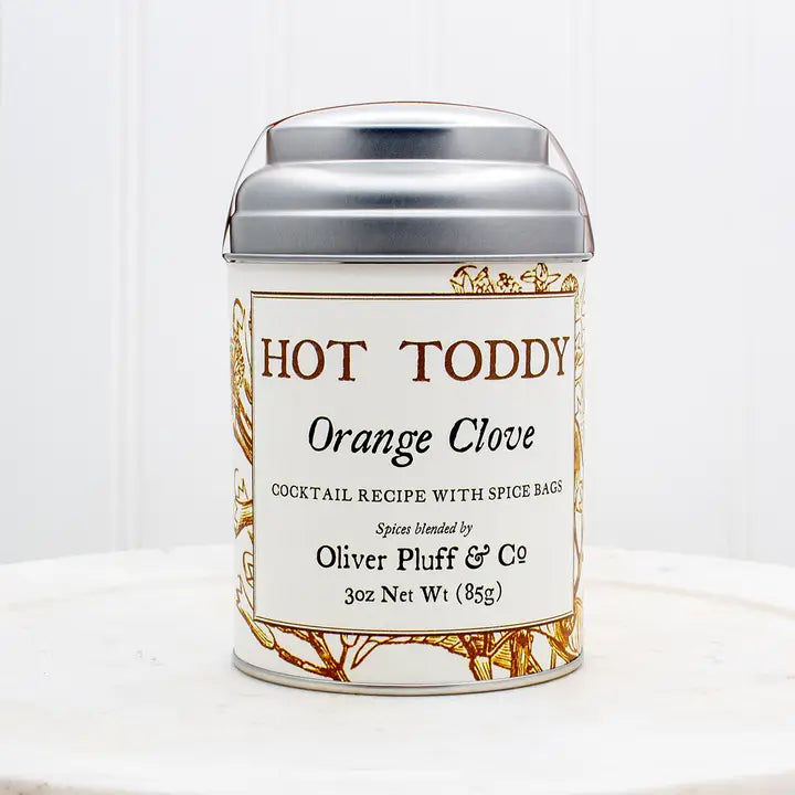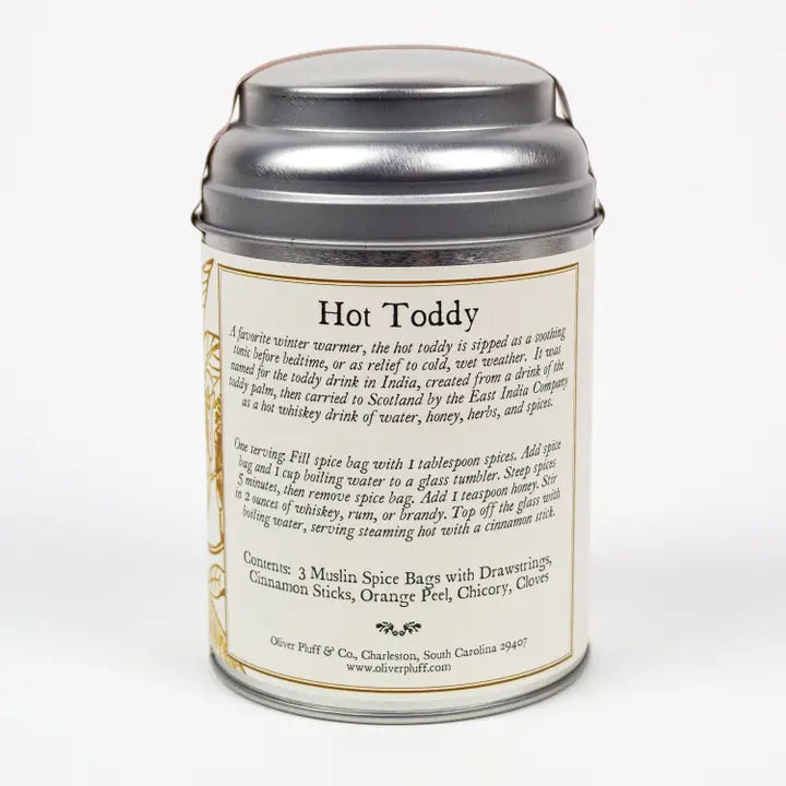 Orange Clove Hot Toddy Kit Description: A Soothing Tonic of Hot Water, Spices, Whiskey, and Honey. A favorite winter warmer, the hot toddy is sipped as a soothing tonic before bedtime, or as relief to cold, wet weather. It was named for the toddy drink in India, created from a drink of the toddy palm, then carried to Scotland by the East India Company as a hot whiskey drink of water, honey, herbs, and spices. Ingredients: 3 Muslin Spice Bags with Drawstrings, Cinnamon Sticks, Orange Peel, Roasted Chicory, Cloves Size/Type: 3oz Spices - Brews 3 Gallons Shelf Life: 3 Years Hand Blended and Packaged by Oliver Pluff & Co. in Charleston, South Carolina