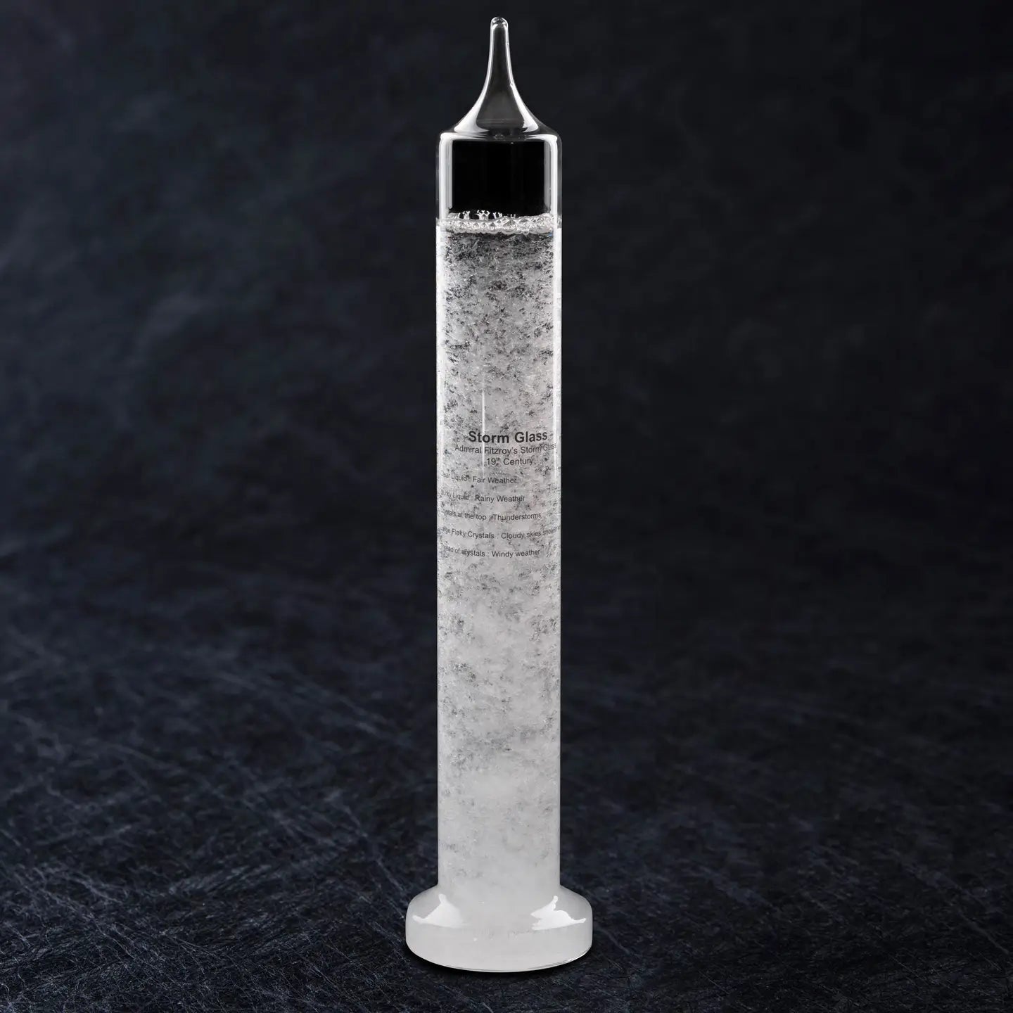 The storm glass was popularised by Admiral Robert Fitzroy after his historic voyage on the HMS Beagle. This storm glass is the same size and shape as our 28cm Galileo Thermometers, and they make an attractive pair on the windowsill. How the Storm Glass works is still a mystery, but it is believed that electromagnetic changes in weather patterns activate the crystals inside (sealed glass chamber fill with crystals when air pressure decreases).  This is a gorgeous decorative gift idea for the adult who has everything or someone who finds meteorology fascinating.  How to read: A: Clear Liquid Bright and clear weather B: Cloudy Liquid Sometimes with small stars and crystals at the top. Cloudy weather and often predicts thunderstorms and rain. C: Small Stars in Liquid Humid or foggy weather D: Large Flaky Crystals Cloudy skies, snow in winter.  E: Threads of Crystals At The Top Winy Weather F: Crystals At The Bottom, Frost may be coming.