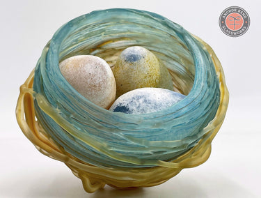 Anchor Bend Glassworks from nearby Newport Rhode Island have created their Bird Nest Sculpture is delicately blown and cradled with texture and natural beauty. Adorned with 3 solid glass eggs speckled with contrasting amber and blue tones.