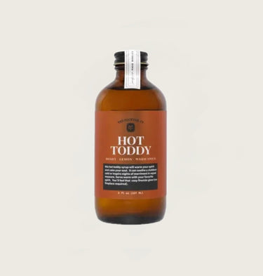 Honey - Lemon - Warm Spice Our Hot Toddy Syrup will warm your spirit and calm your soul on chilly nights. It can soothe a stubborn cold and inspire nights of merriment in equal measure. Serve warm with your favorite spirit. You’ll feel that cozy fireside glow (No fireplace required). Fresh lemon, wildflower honey and warm spice combine in this cold weather favorite. Just add to hot water and your favorite spirit for a perfectly crafted toddy! ingredients: pure filtered water, cane sugar, honey, lemon juice, spices, citric acid. Size:8 oz bottle // Yield: 10-16 cocktails // Shelf life: 2 years