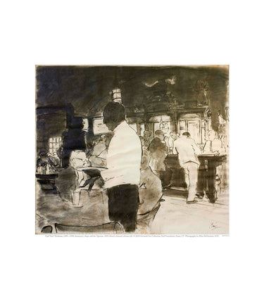 A prominent NY fashion/advertising illustrator, Ericson as a Griswold guest, signed this drawing for Innkeeper Arthur Lovell placed at far right of the bar. Also depicted the well-remembered waiter "Major" and the artist himself to immediate left. Digital version