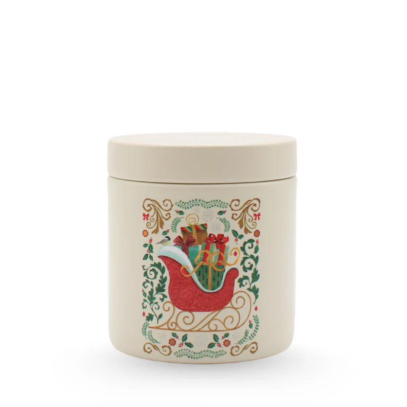Classic Christmas hearth soy candle in a 9 oz metal candle with lid, featuring a custom printed design with notes of pine, fir, orange peel, and spice.