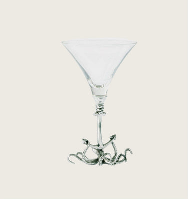 The base and stem of the octopus pewter-stemmed cocktail glasses are intricately detailed; a kraken-style octopus lifts an impressive anchor while balancing the glass wine bowl in decoratively detailed tentacles. A delightful, amusing choice for serving an Octopus' Garden Martini or a shrimp cocktail, octopus glasses are at home in your beach house or at your Steam Punk-themed soirée. Size: 7.75" H 10 oz. Care: Hand wash recommended. If placed in a dishwasher, use low heat and a mild soap.