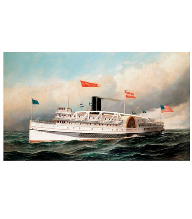 Built at the peak of the steamboat industry's "good times" The Connecticut was launched by the Stonington Steam Ship Company along with Providence, and Massachusetts; designed to compete with the Fall Rivers Line Pilgrim and Puritan. Individually and collectively, these ships represented the biggest, best and most innovated among steamboat art and technology. The original oil on canvas painting is 30" x 50" and is prominently displayed in the Wine Bar at the Griswold Inn.