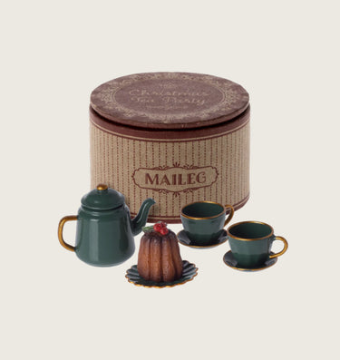 Decorate a cozy Christmas tea table with this lovely set. It is perfect in size for the mouse family. In the beautiful giftbox you find a metal tea pot, two cups, a plate and a deliciously decorated cake made in polyresin.