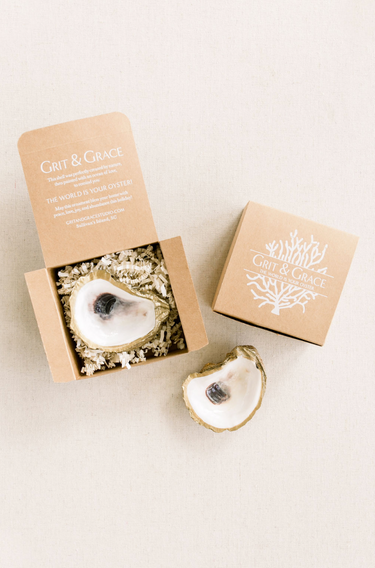 Grit & Grace creates these elegant gilded oyster jewelry dishes are a beautiful nautical accent for your home, and they are the only oyster shell dishes that give back: we recycle ten oyster shells for each oyster ring dish sold. Our packaging reminds your loved one, “The World Is Your Oyster!” with a scripted message on the inside of our eco-friendly box, which also contains 100% recycled crinkle paper. The dimensions of the gilded oyster shell dish are approximately 3.5” by 2.5”, and each oyster is unique.