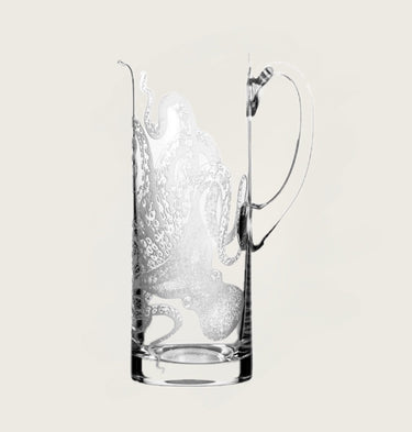 Lucy, favorite denizen of the deep, wraps herself around this tall pitcher, enfolding your favorite drink in her watery embrace. Lucy is carefully created by hand, using a sand-etching technique that renders her form deep into the glass. She's one of a kind, and this pitcher is too.