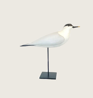 Hand carved and hand painted Tern on a custom steel. Carved from sustainably harvested and locally sourced Atlantic White Cedar, with hand-blown crystal eyes, perched on an art gallery style base, and a custom distressed paint finish.