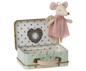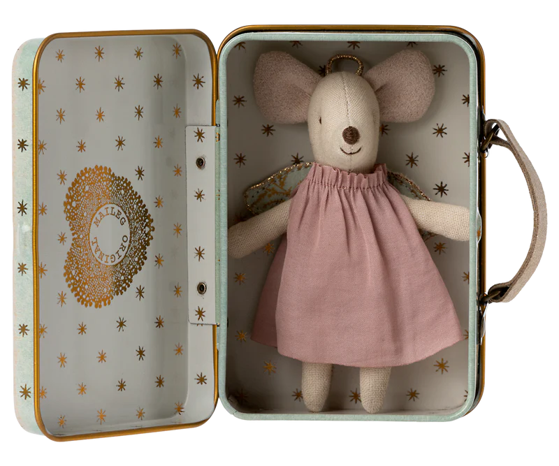 Maileg's Guardian angels do their best to protect and watch over the little ones. This guardian angel comes in a mint-colored metal suitcase.