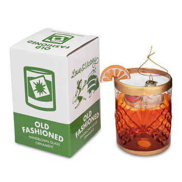 Nothing warms the heart and soul quite like the classic Old Fashioned. This ornament looks good enough to sip with its frosty ice and detailed garnishes of cherry and orange. No whiskey lovers’ tree is complete without this hand-blown and hand-painted ornament. The perfect gift for yourself or others! Comes packaged in a custom-made box printed with a retro holiday design that’s just too good to hide with wrapping paper. 3.75 x 2.75”