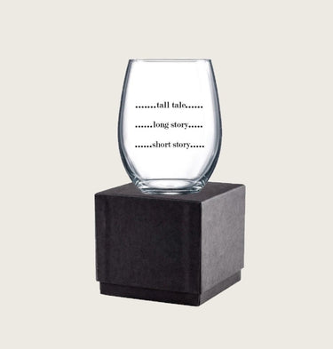 What's your story? Tell it over a glass of wine with our 15oz stemless wine glass! Short Story....Long Story...Tall Tale!